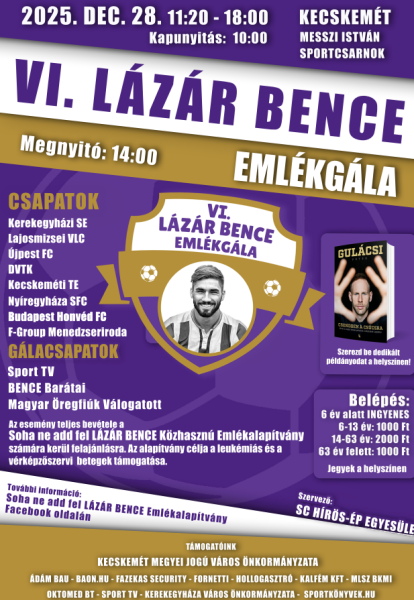 A kecskeméti születésű Lázár Bence tragikusan fiatalon, csupán 26 esztendősen leukémiában hunyt el 2018-ban. Karrierje az Újpest FC-vel fonódott össze, szerepelt Nyíregyházán is, de jó szívvel emlékeznek rá korábbi, ifjúkori állomáshelyein, Lajosmizsén és Kerekegyházán is. A tiszteletére rendezett öregfiúk emléktornán korábbi csapatai is képviseltetik magukat. A Lázár Bence Emlékgála rendre népes közönséget mozgat meg, idén már hatodik alkalommal rendezik meg.