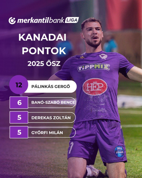 Statisztikáink sorát a kanadai pontokkal folytatjuk, mely nem mást jelent, mint egy játékos összes szerepvállalását csapata góljaiban, legyen szó gólpasszról vagy gólról. Ebben a kategóriában Pálinkás Gergő áll az élen az egész NB II-ben.