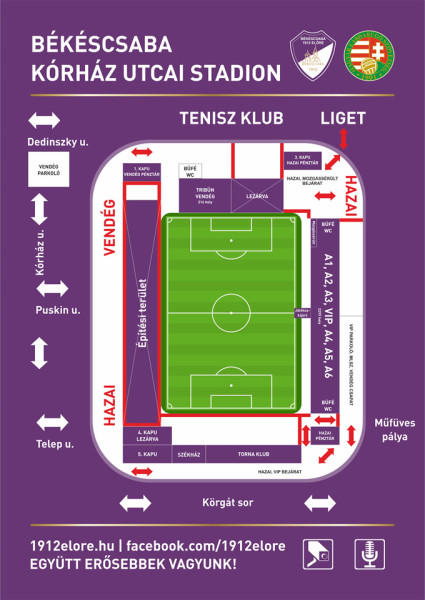 A vendég drukkerek a számukra kijelölt, Munkácsy Hotellel ferdén szemben található (Kórház és Dedinszky utca sarok) őrzött parkolóban, biztonságos körülmények között állíthatják le gépjárműveiket. A Kórház utcán átkelve, csak a 2-es számú kapun léphetnek be a mérkőzésre drukkereink, mely közvetlenül az alábbi alaprajzon jelzett 1-es beléptetési pont mellett található. A parkolás ingyenes. A vendég szektorban büfé üzemel és mellékhelyiségek is biztosítottak. A tribün megnyitott részén 216 ülőhely áll rendelkezésre.